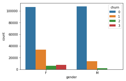 - A rather stright forward Ansatz could be, that churning can already be predicted by a fall of number of consumed songs in the second half of the registration time in respect to the first half.